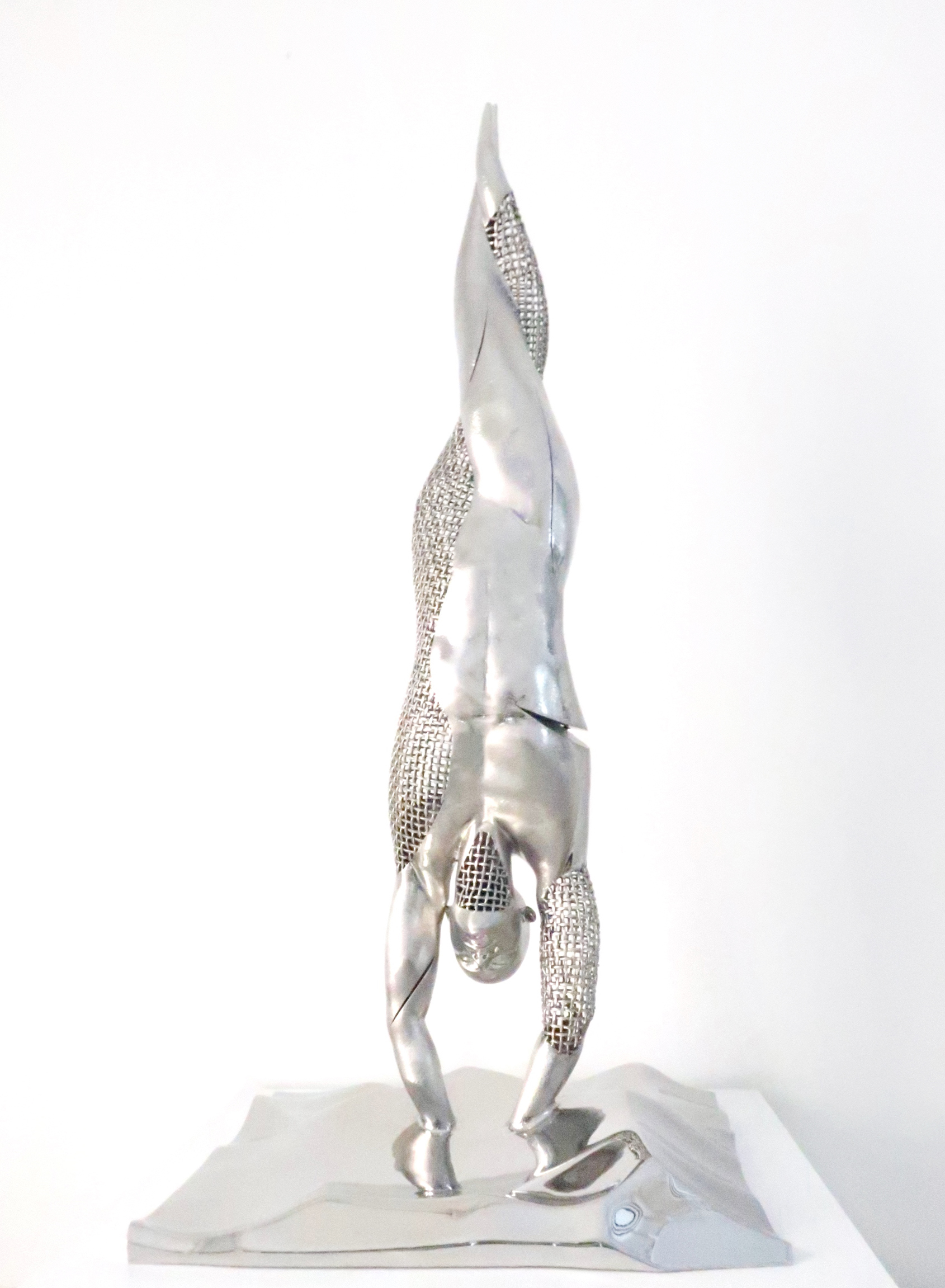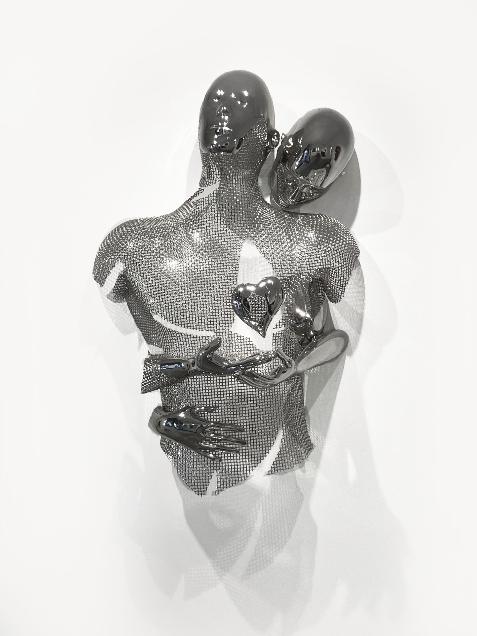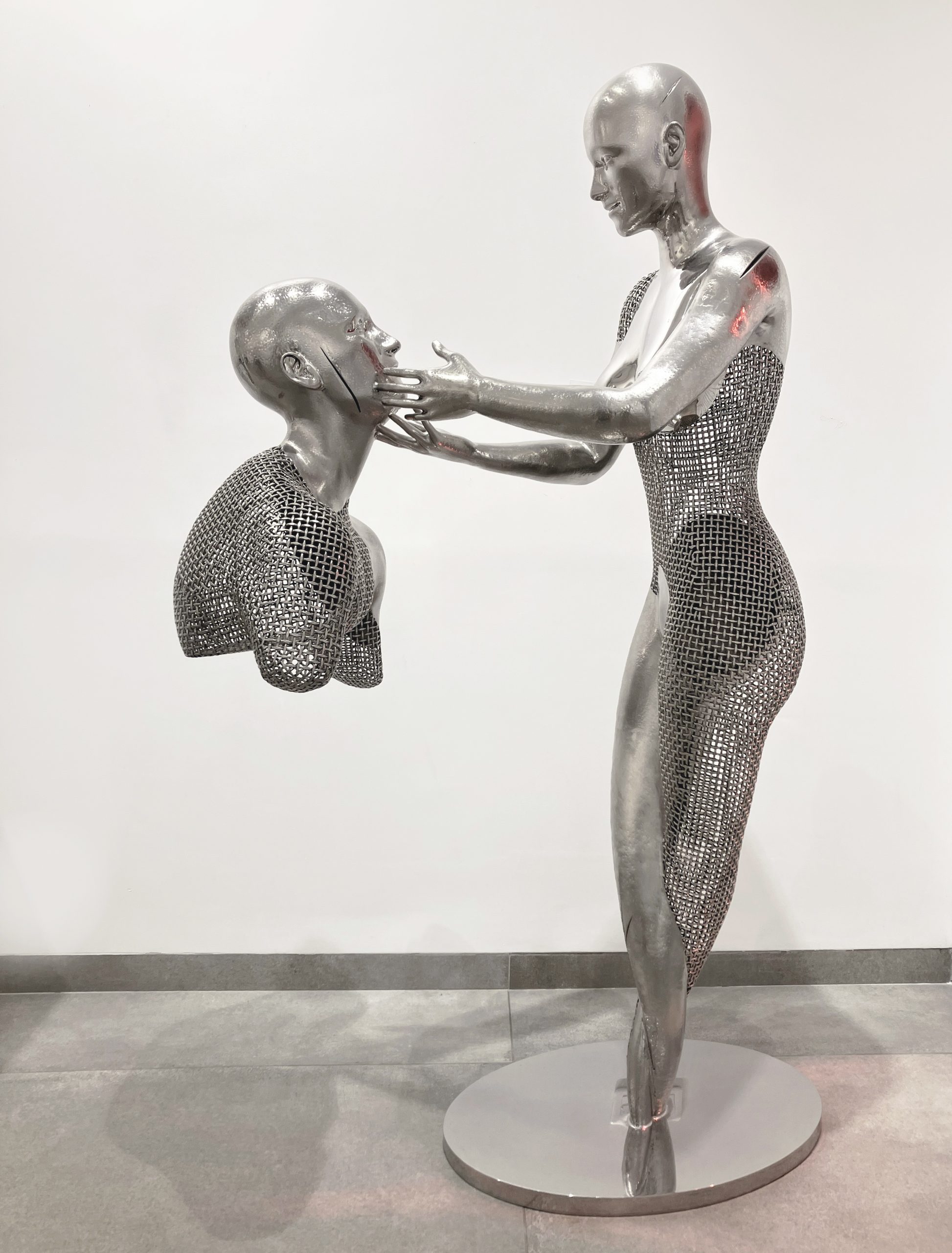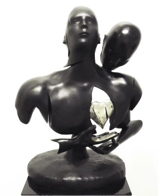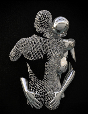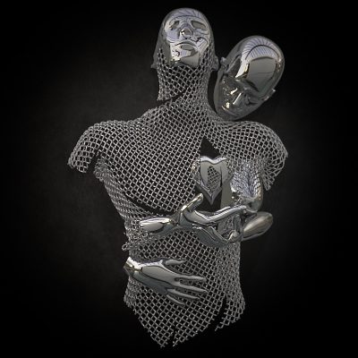 Franck Kuman is a French artist who initiated himself as an autodidact in Design as well as in sculpture. An inspiration without borders, driven by a passion for immaculate lines, has been at the service of his creations for nearly 26 years. Kuman’s achievements are further characterized by the sensual and modern use of mirror polished or hammered stainless steel, iron mesh and bronze. Although made of heavy materials, the characters represented by the artist stand out for their lightness. Aerial, they seem to float. These androgynous figures play with the spatiality they invest. Sometimes linked, often fragmented, these delicate characters are presented to us by the languor of their gestures. Witnesses to a real sensitivity, Kuman’s sculptures also represent a much more personal story … His art is revealed through the painful trials of his life. He expresses all his contained suffering, his hopes, his strength, and his determination. Catharsis of modern times, he thus draws a world where art is the captain of its destiny and in which his soul is master.